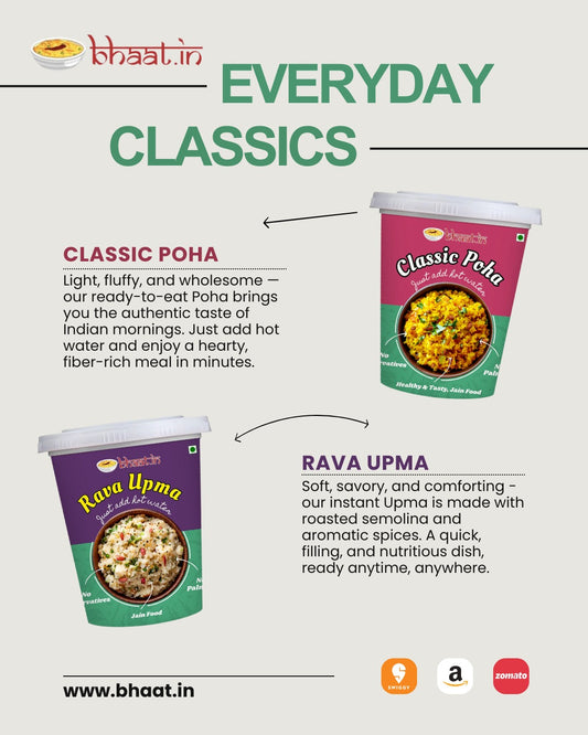 Dehydrated - Jain Breakfast combo-Poha & Upma|Just add hot water|Ready to Eat|Serves 2