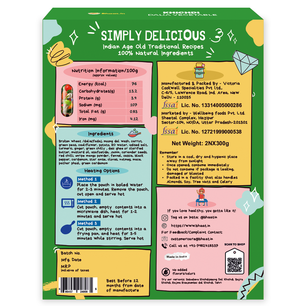 Gujarati style Dalia vegetable khichdi also known as fada ni khichdi is a whole-some meal prepared with broken wheat, moong dal ,vegetables and mild spices. No preservatives, no adding of hot water needed.Its ready to serve! Perfect for breakfast and anytime hearty meal. Suited for kids too and diabetic friendly.