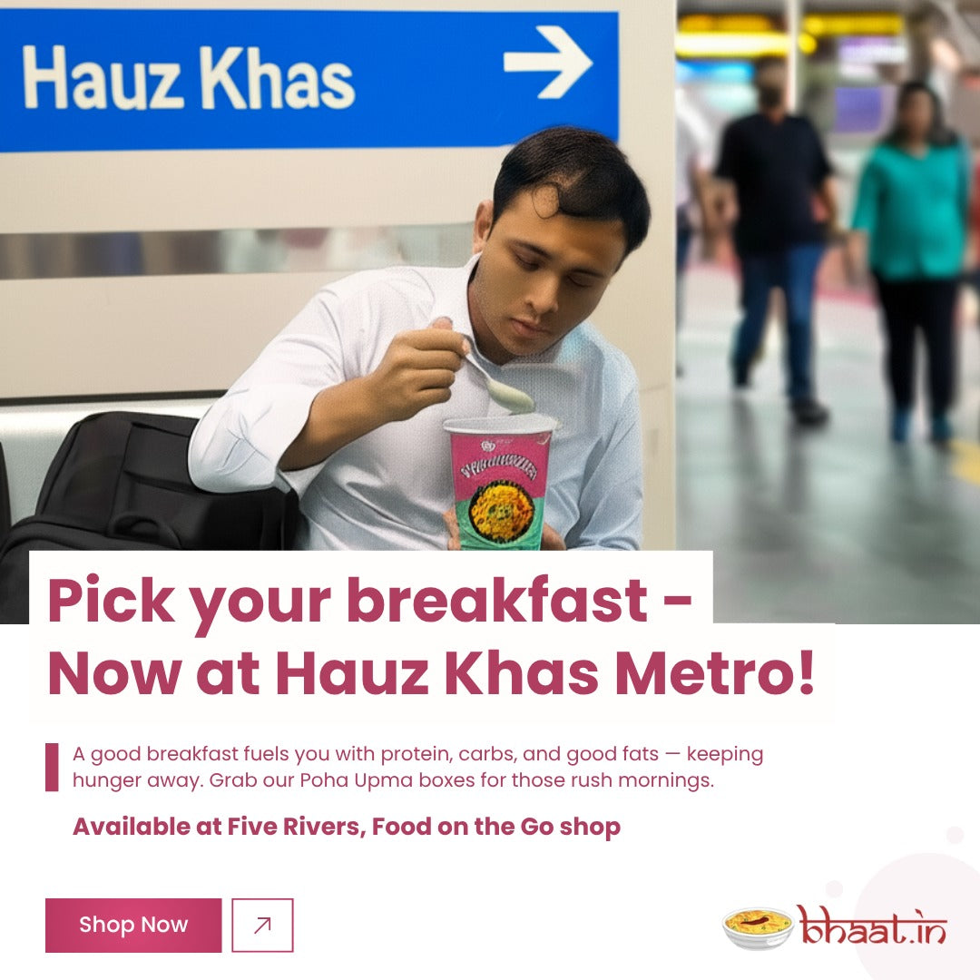 Bhaat.in Poha& upma is specially made to give you the instant energy boost as a perfect breakfast dish as a post workout meal. It is made with flattened rice / Rava ,peanuts & fresh curry leaves.Homestyle taste, wholegrain, high-protein, regional recipe.