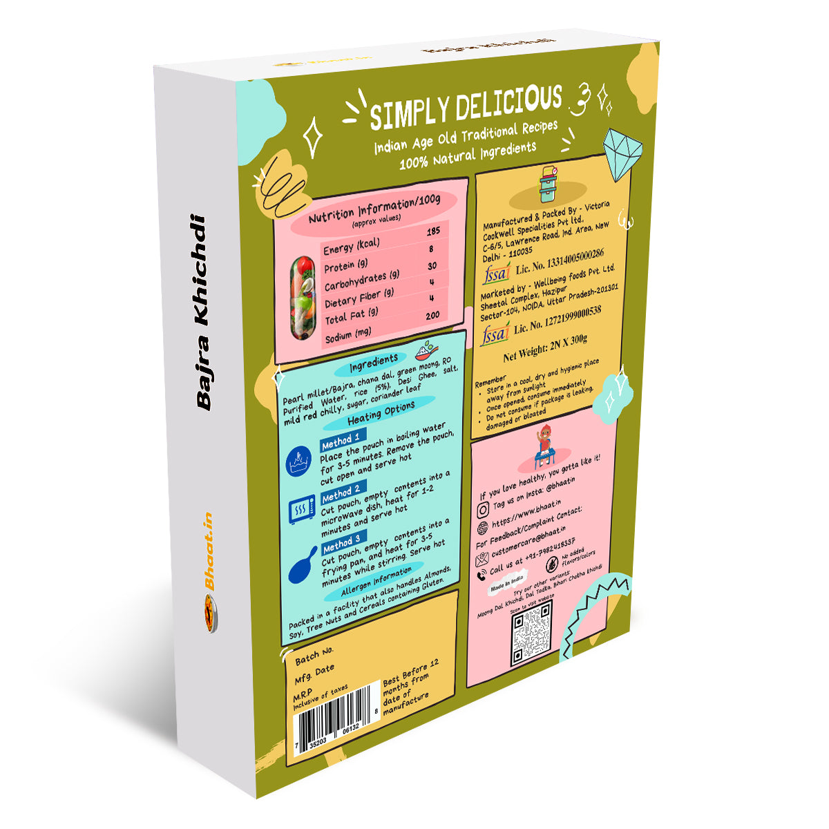 - Ingredients: Pearl Millet/Bajra, Chana Dal, Green Moong Dal, RO Purified Water, Rice (5%), Desi Ghee, Salt, sugar(1%)