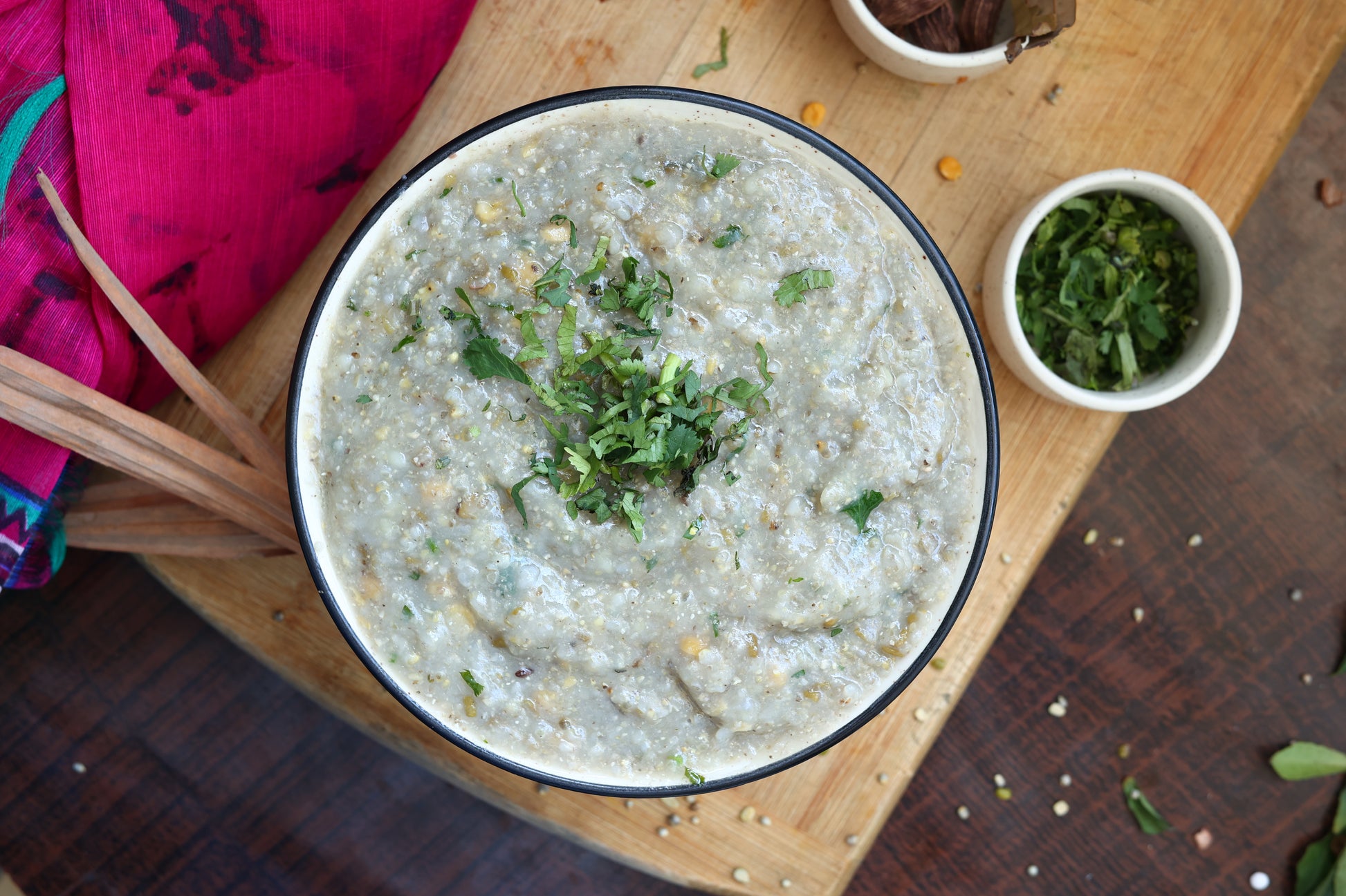 Bhaat.in Bajra Khichdi(with lesuni chutny) is a wholesome meal, inspired from villages of Haryana. Its slow cooked with lentils and is perfect fiber rich refreshing meal.